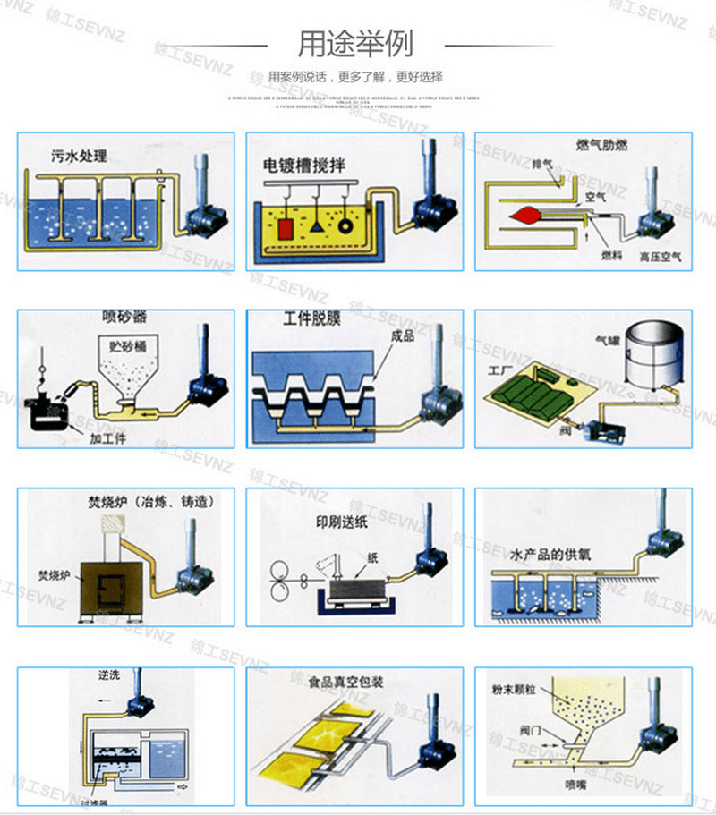 壓送用途:廢水處理,電鍍攪拌,曝氣增氧,氣力輸送,風(fēng)刀烘干,水泥機(jī)械,造紙?jiān)O(shè)備,化工等。